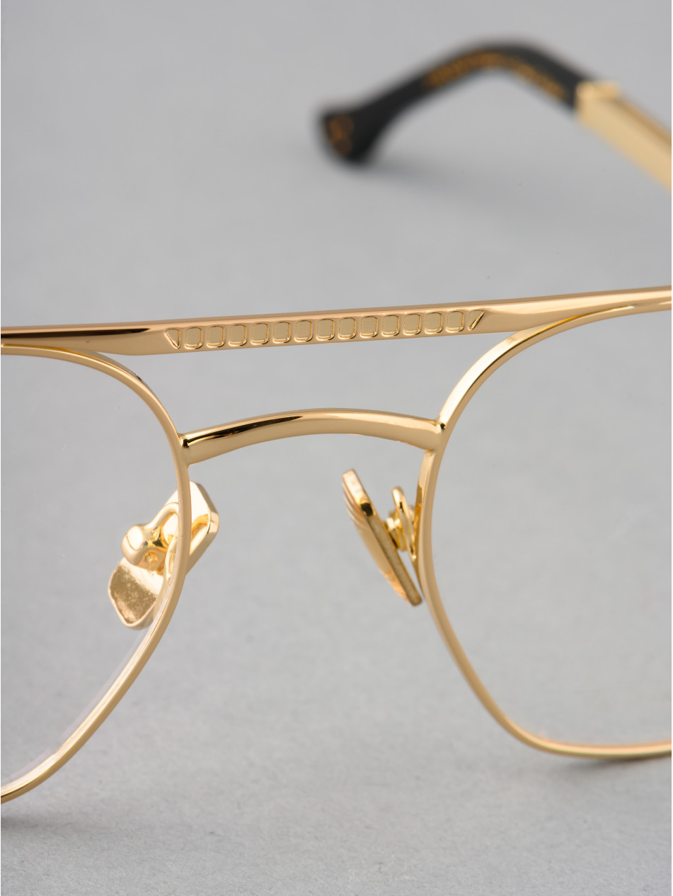 This optical framewith a retro look and hexagonal shape is adorned with meticulous details engraved on both the upper bridge and on each of its branches. It will bring you optimal comfort with its silicone pads and flexible temples. The style of its opulent temples that marks this new collection will make it a model that will become your new identity.