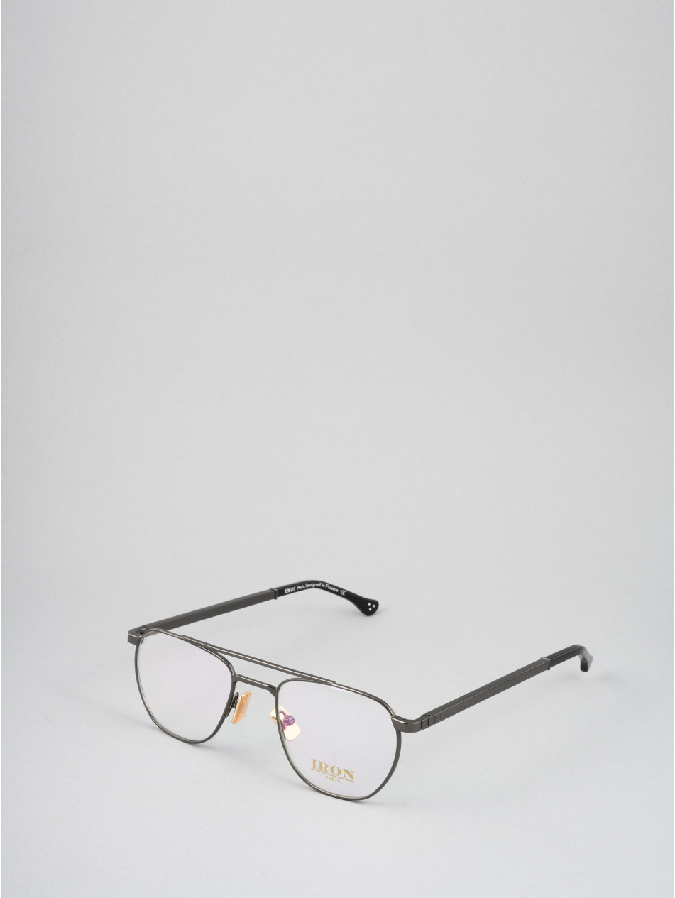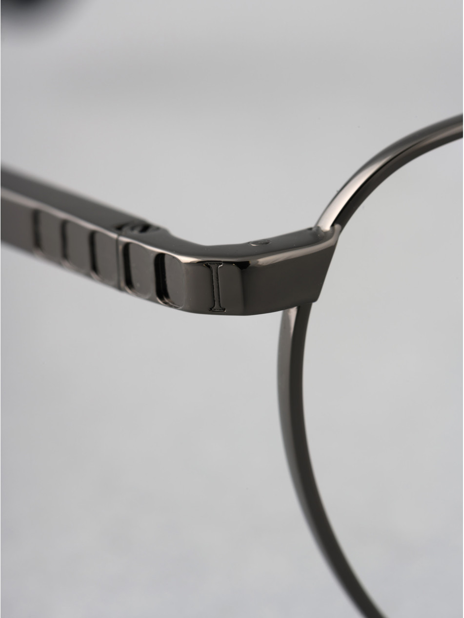 This geometrically shaped framehas a double bridge. Its massive temples with laser-engraved details including the brand's emblematic "I" will make this eyeweara timeless item in your collection. This limited-edition optical model is available in several colors: dark gun, silver-grey, and 24-carat gold-plated.
