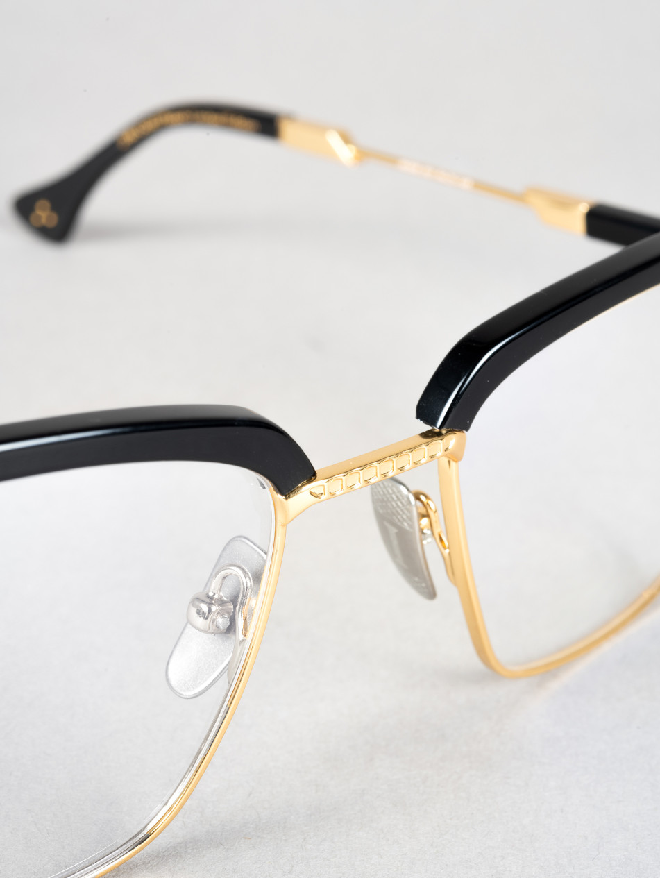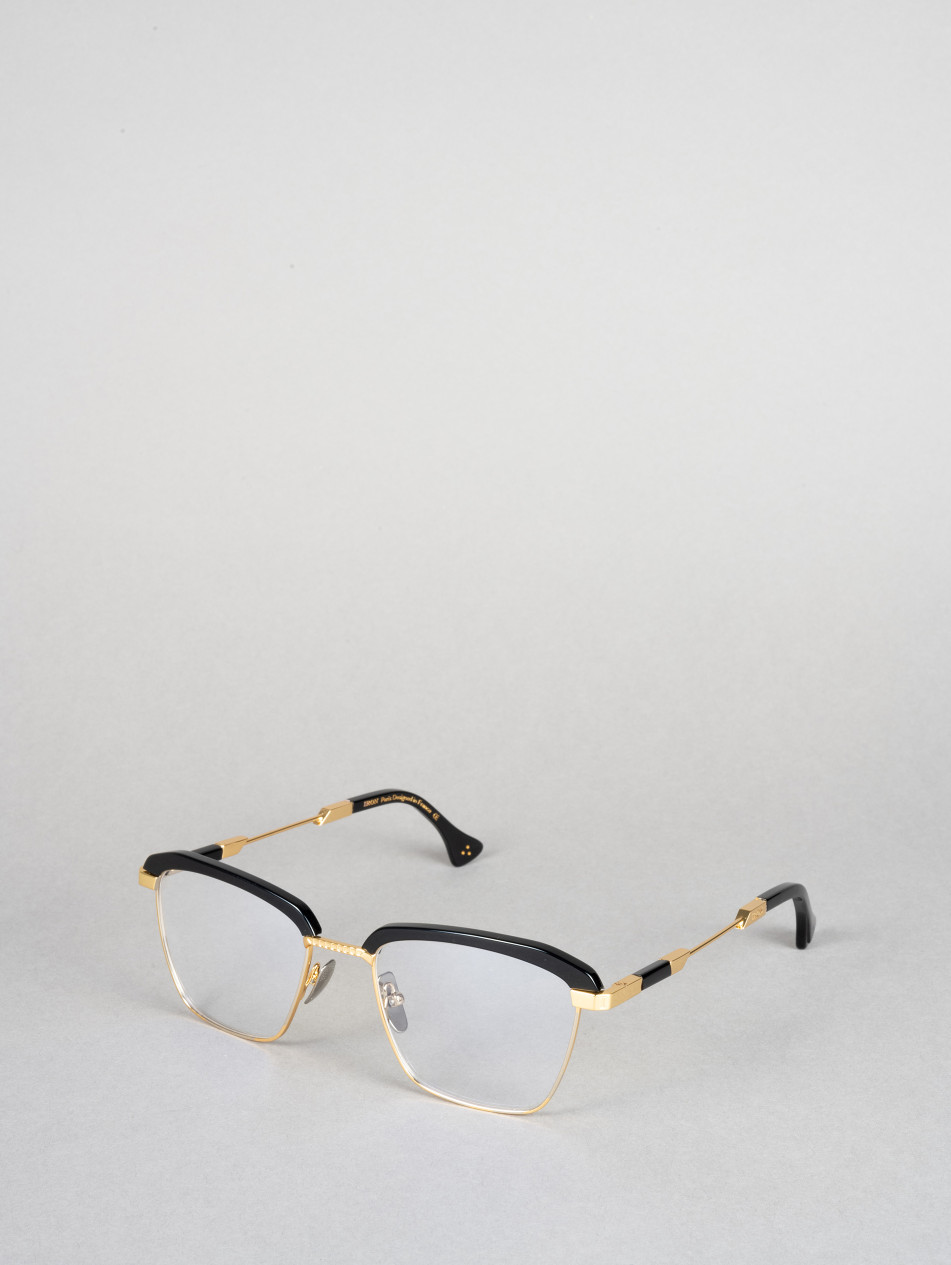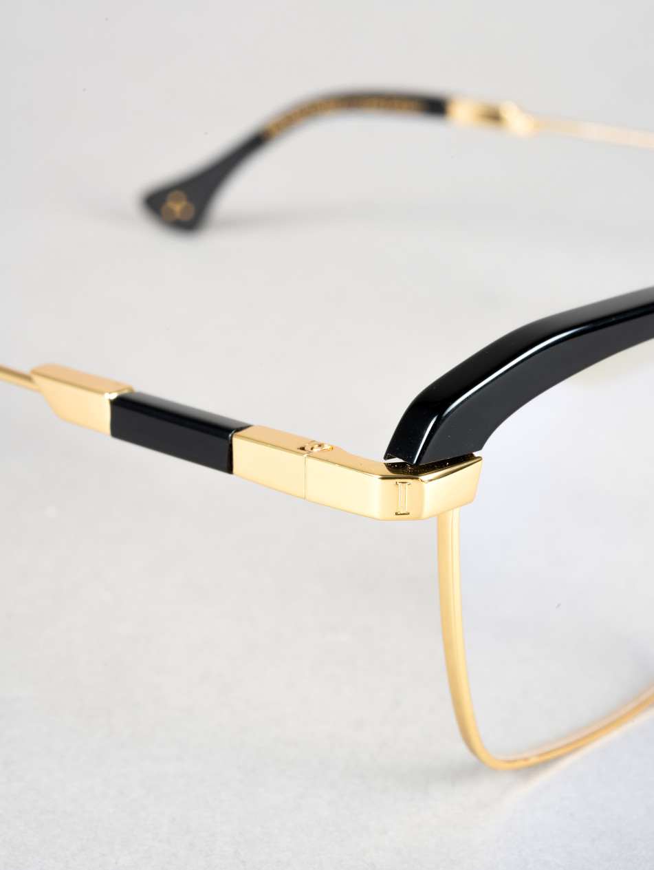The IRO56 model features a rectangular optical frame in black acetate with gold and silver metallic accents, adding a contemporary touch inspired by the geometric shapes of the 80s.