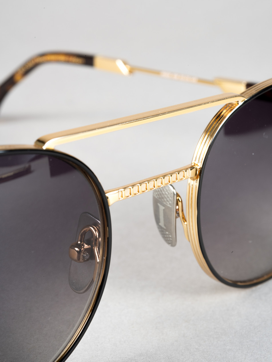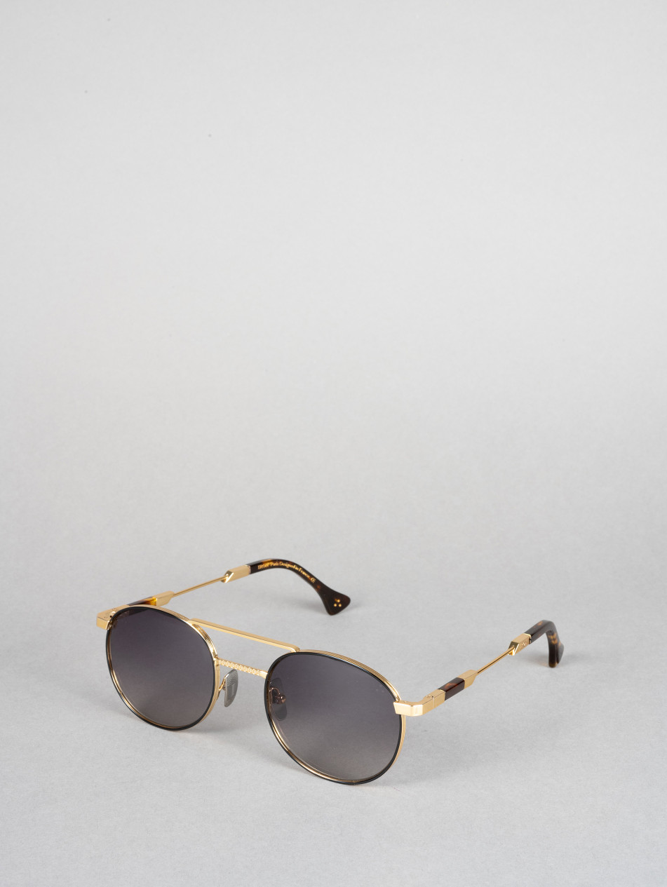 The IRS58 model embodies a distinctive contemporary style. With its round frame and striking double bridge, this pair is enhanced by a touch of sophistication with its black band on the temples. Available in silver, gold and black.