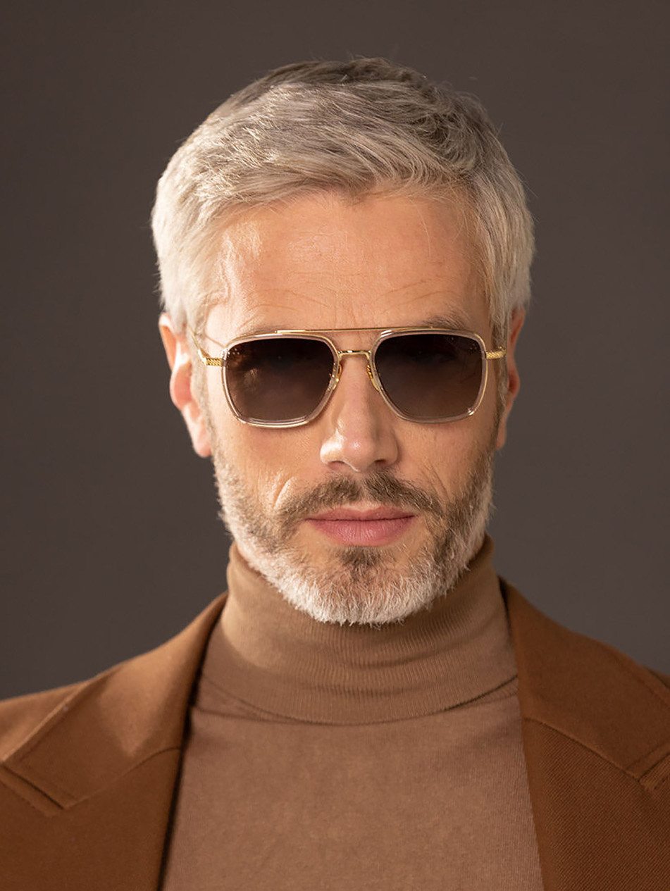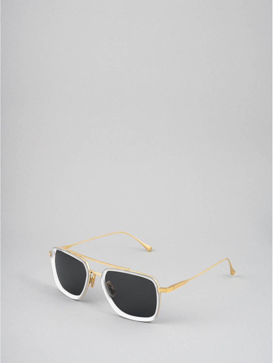 The elegant. A model with a strong temperament with its square shape and elegant double bridge. An acetate and metal sunglasses frame available in gold and silver, ecialle and gold, matte black and gold, temples finely punched in relief which bring an assertive character to the aviator style. "Metal effect" silicone pads with the IRON Paris logo for optimal comfort.