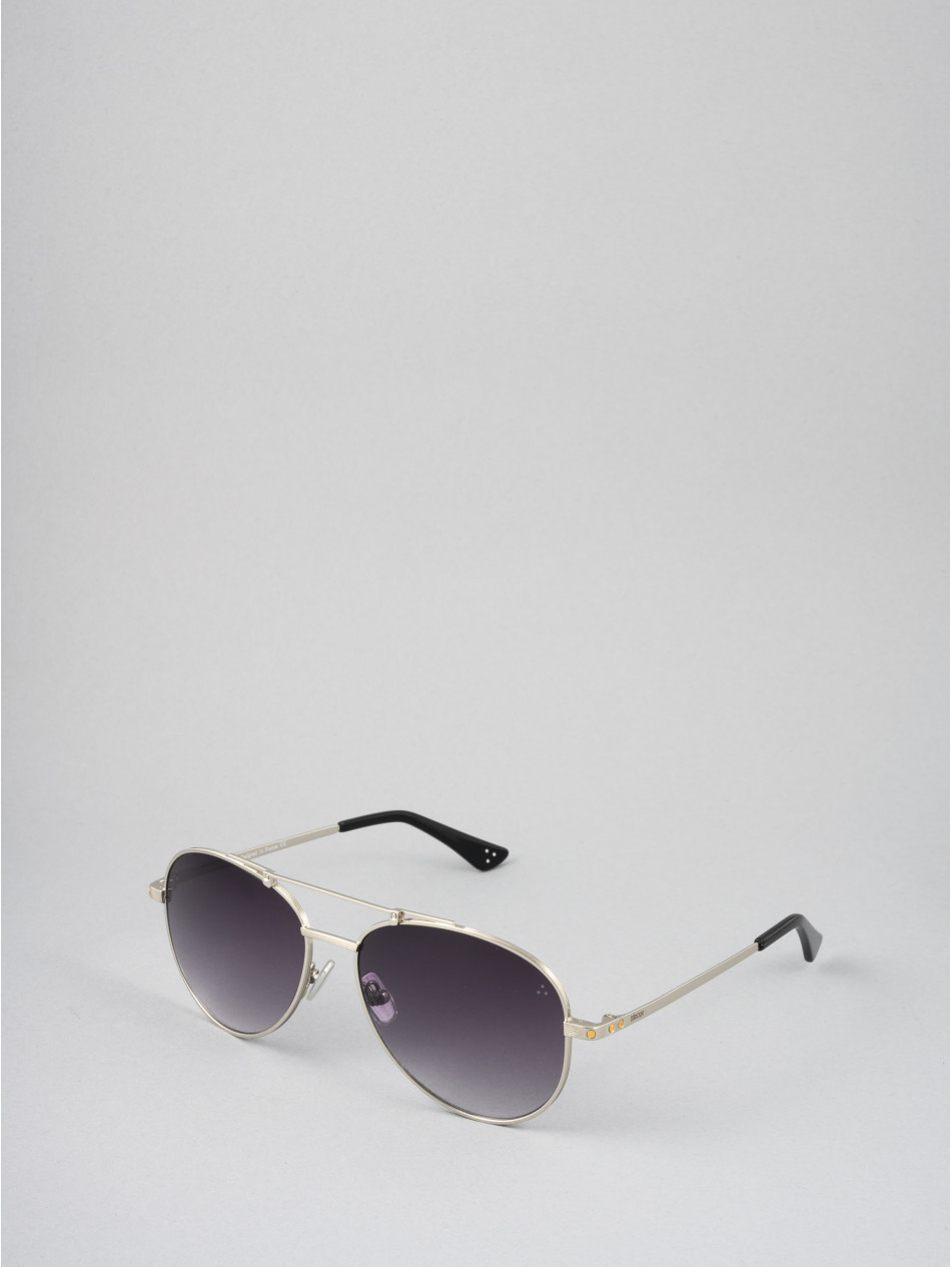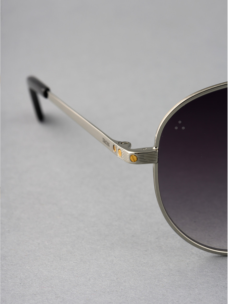 The iconic '80s old school features a revisited double bridge. The temples are meticulously set with a two-tone screw combo. Your comfort is assured by "metal effect" silicone pads signed IRON Paris. Available in gold or silver, these sunglasses are precision-cut to enhance any face. This sunglasses model is also available in optical.
