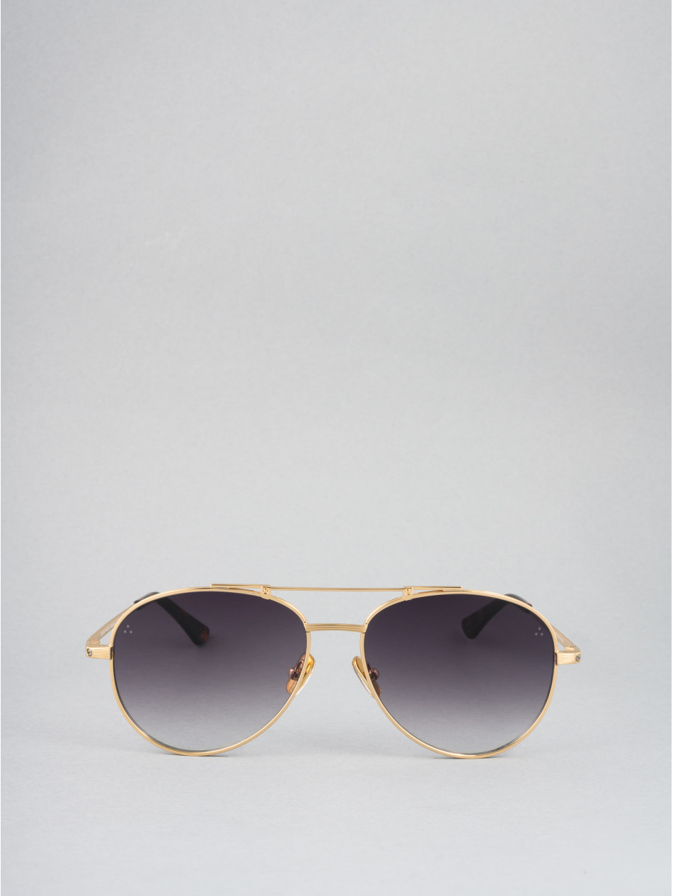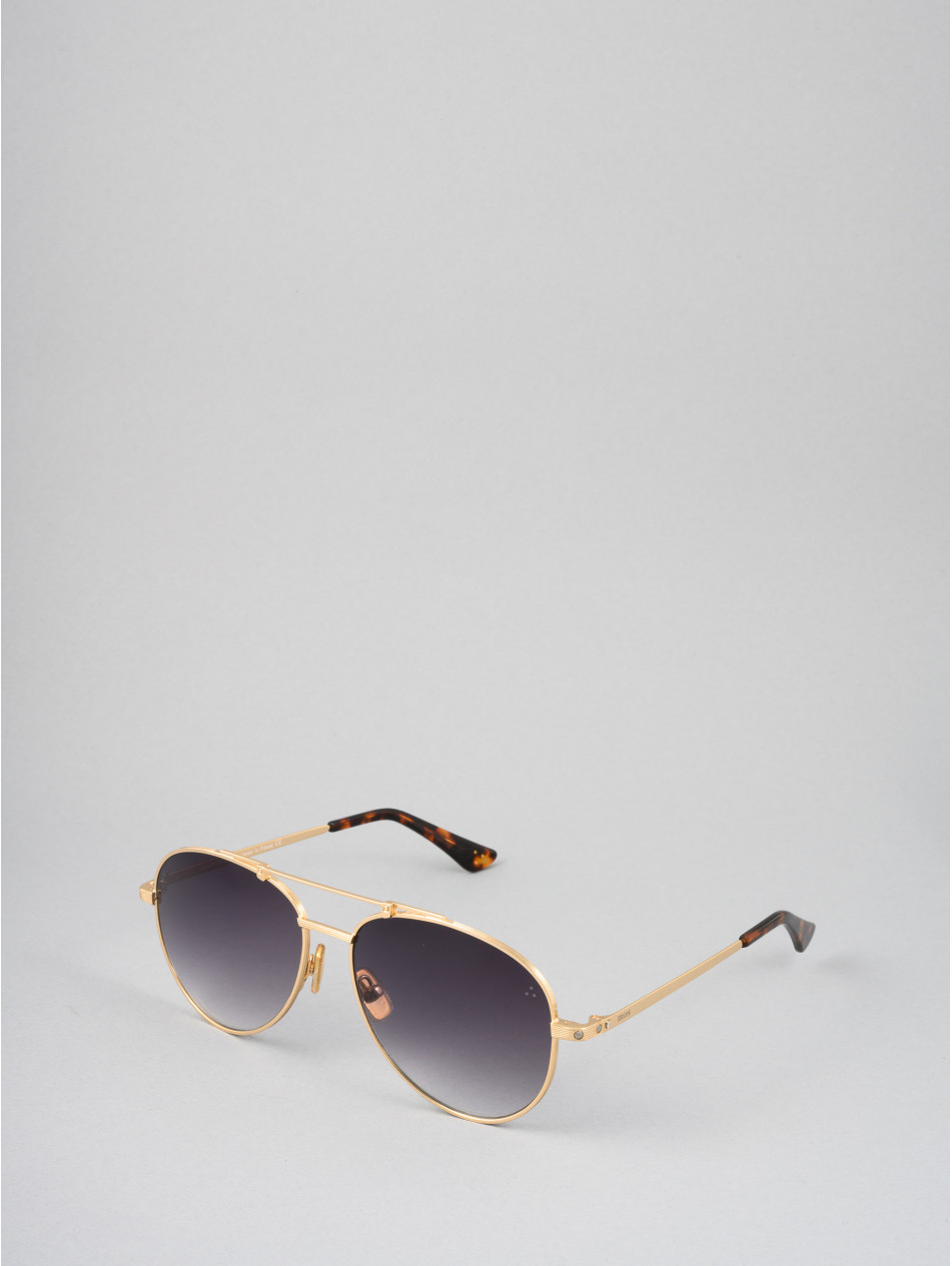 The iconic '80s old school features a revisited double bridge. The temples are meticulously set with a two-tone screw combo. Your comfort is assured by "metal effect" silicone pads signed IRON Paris. Available in gold or silver, these sunglasses are precision-cut to enhance any face. This sunglasses model is also available in optical.