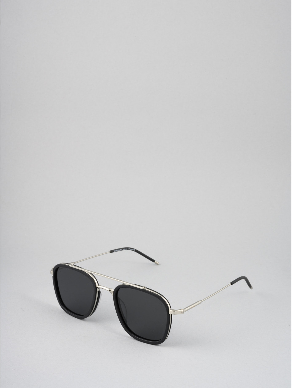 The exclusive. Our square style sunglassesare enhanced with a double bridge. An acetate strapping in different colours: black, matte black, blue or havana, reveals a gold or silver metal insert. Matching temple tips, anti-reflective lenses and meticulously engraved IRON Paris temples bring lightness and style to this universal frame.