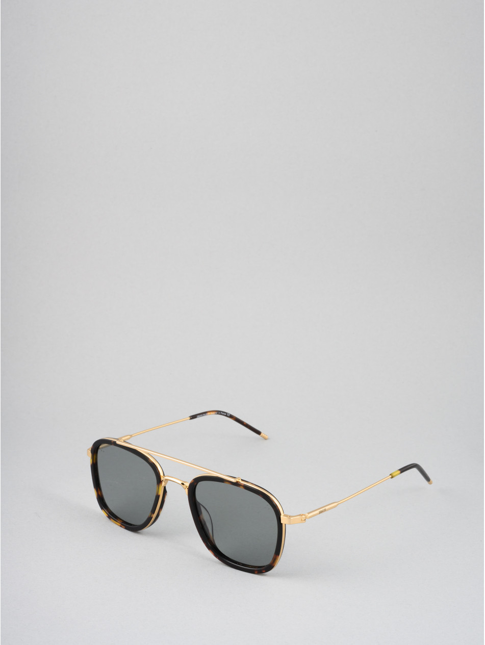The exclusive. Our square style sunglassesare enhanced with a double bridge. An acetate strapping in different colours: black, matte black, blue or havana, reveals a gold or silver metal insert. Matching temple tips, anti-reflective lenses and meticulously engraved IRON Paris temples bring lightness and style to this universal frame.