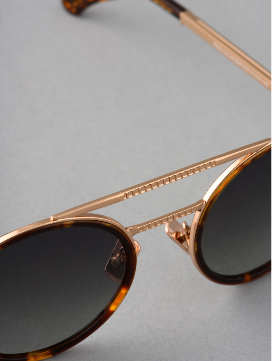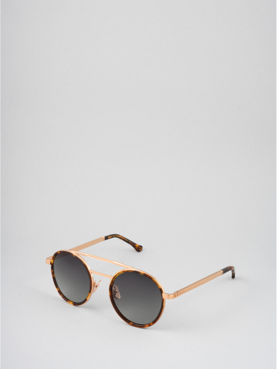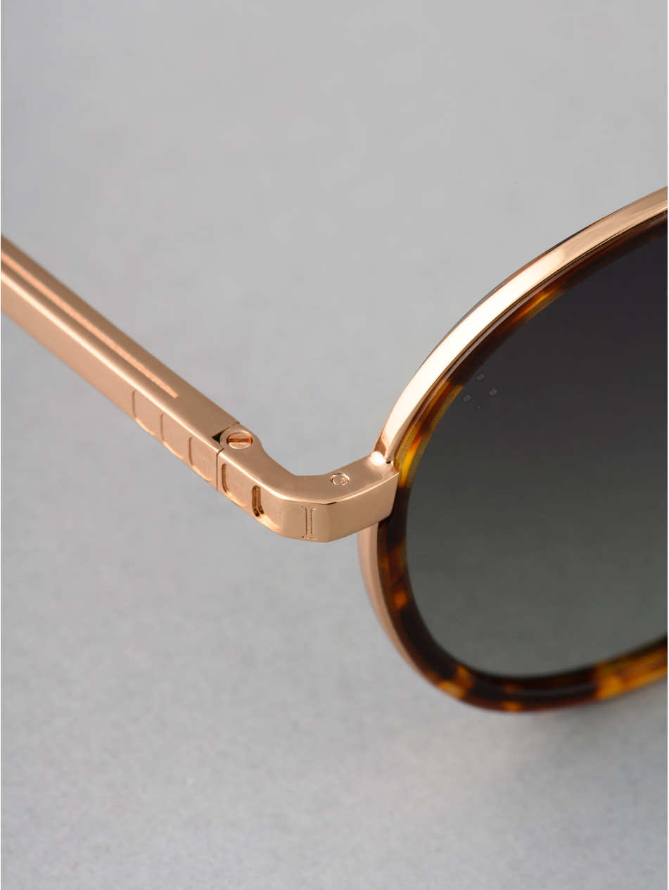 The basic of a round sunglasses, with the audacity of IRON Paris. Finely chiseled double bridge and Havana tortoiseshell acetate strapping, revealing a discreet metal insert for an incomparable profile. A finishing ring and a matching sleeve bring subtlety and finesse to the finishes of this model, available in gold plated and rose gold plated in 24 carats. The frame is equipped with anti-reflective gradient lenses, silicone "metal effect" pads and Flex temples elegantly branded IRON Paris to never leave comfort aside.