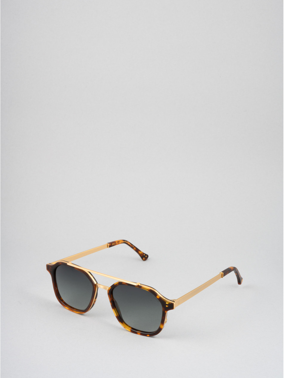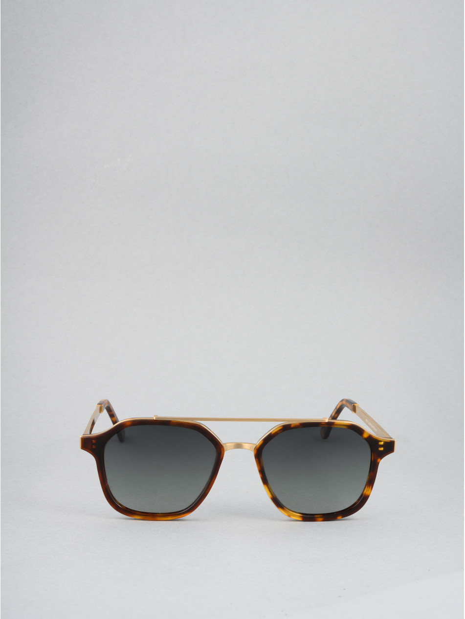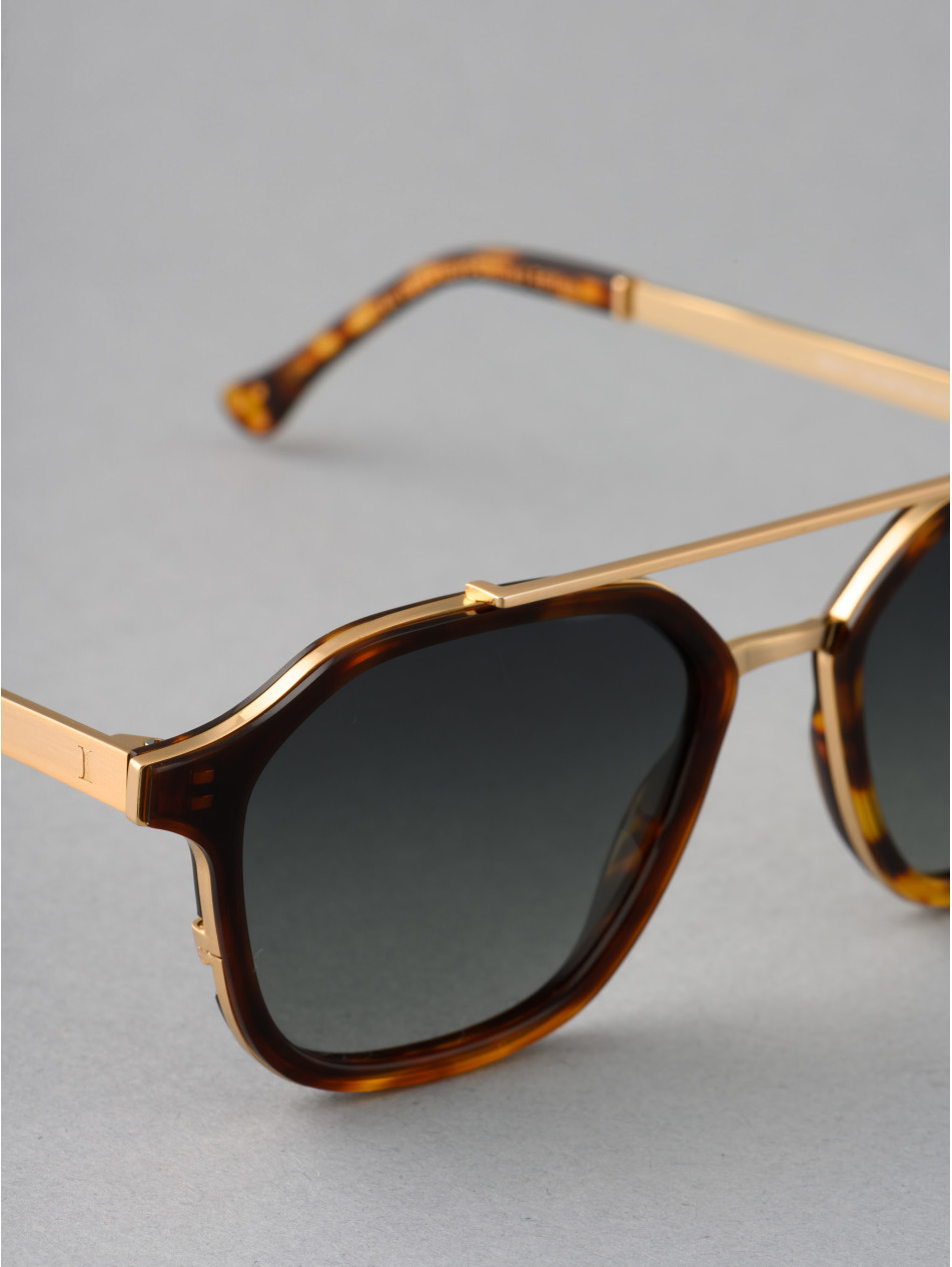 Our limited edition SQUARE model, the chic ally in all circumstances. A revisited pilot shape with double bridge and black or havana acetate strapping, revealing a metal insert for an incomparable profile. A finishing ring and a matching sleeve bring subtlety and finesse to the details of this sunglasses model available in 24-carat gold-plated and silver-plated..