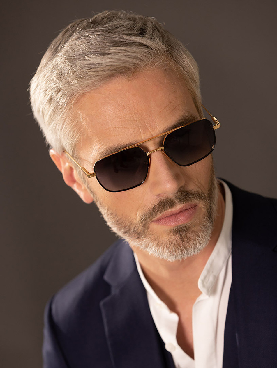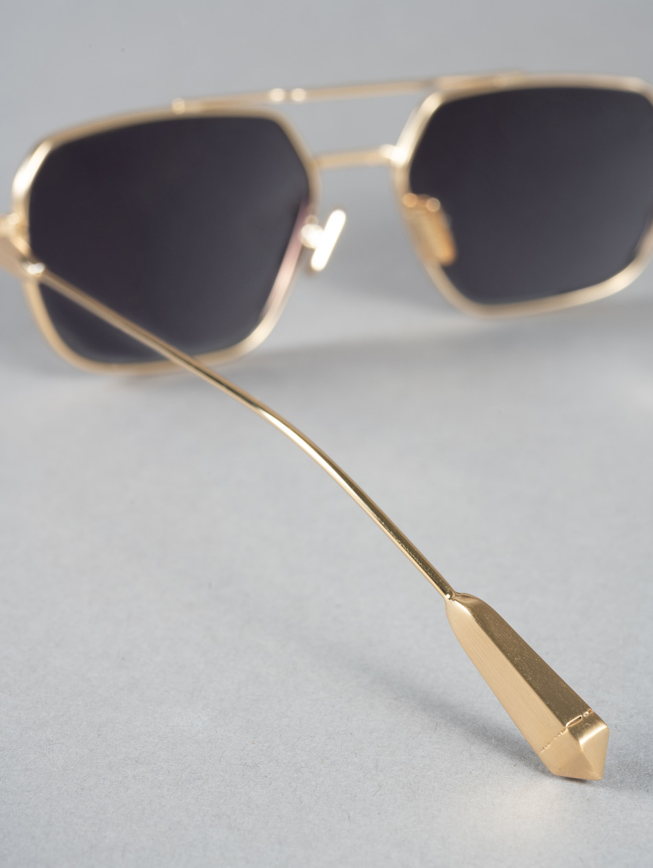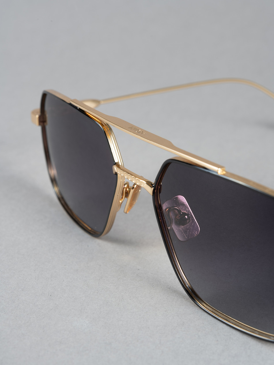 The IRS50, "EDEN" is an elegant sunglasses with a double bridge and "I" shaped inserts, the emblematic IRON PARIS trademark. Available in three colors: yellow gold, silver, and a gold and black model. Its charismatic design and Art Deco style make it an object of desire.