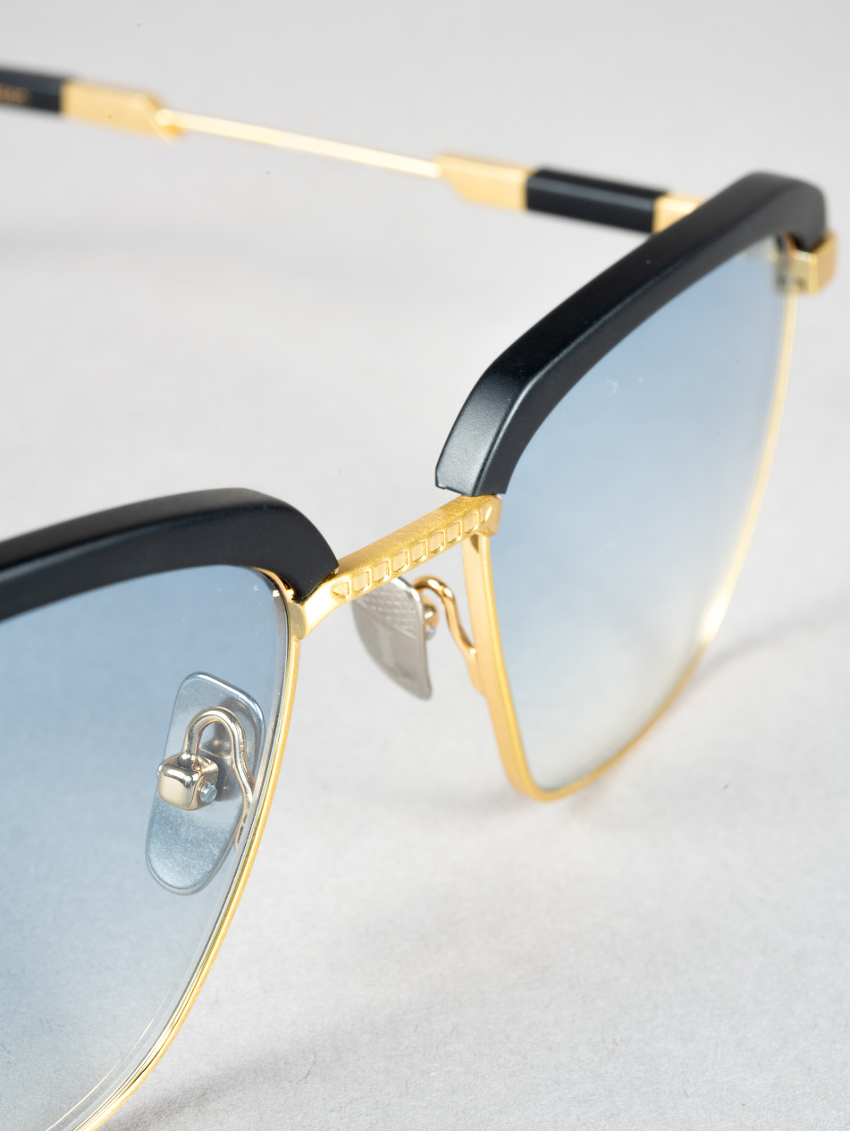 Le modèle IRS56 présente une monture solaire rectangulaire en acétate noir avec des détails métalliques dorés et argentés, offrant une interprétation moderne inspirée des formes géométriques des années 80.