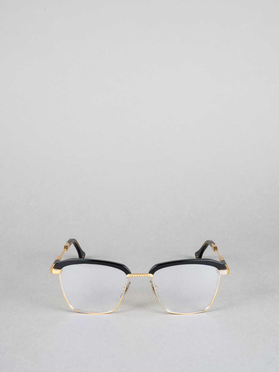 Le modèle IRO56 propose une monture optique rectangulaire en acétate noir avec des accents métalliques dorés et argentés, apportant une touche contemporaine inspirée des formes géométriques des années 80.