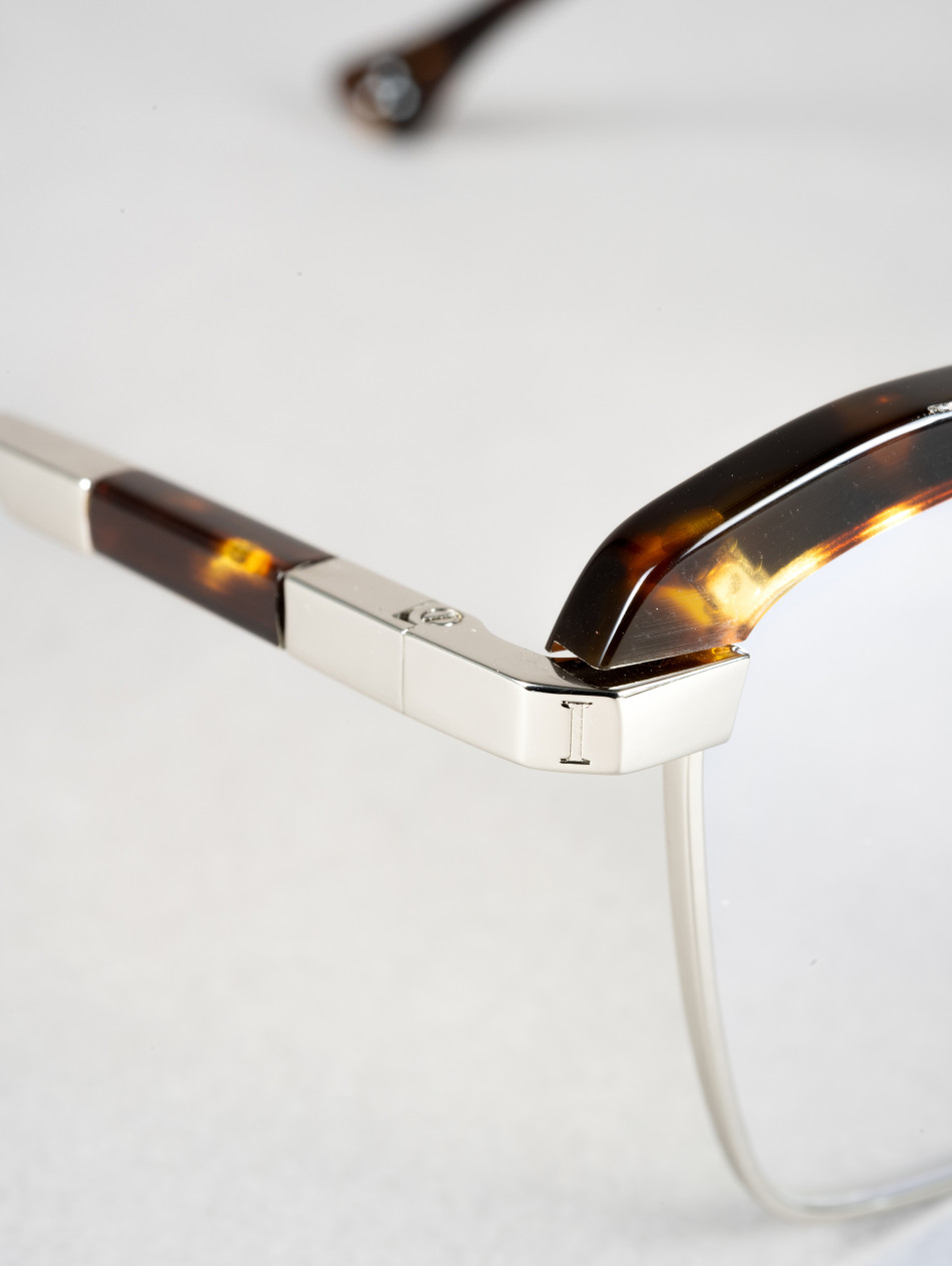 Le modèle IRO56 propose une monture optique rectangulaire en acétate noir avec des accents métalliques dorés et argentés, apportant une touche contemporaine inspirée des formes géométriques des années 80.
