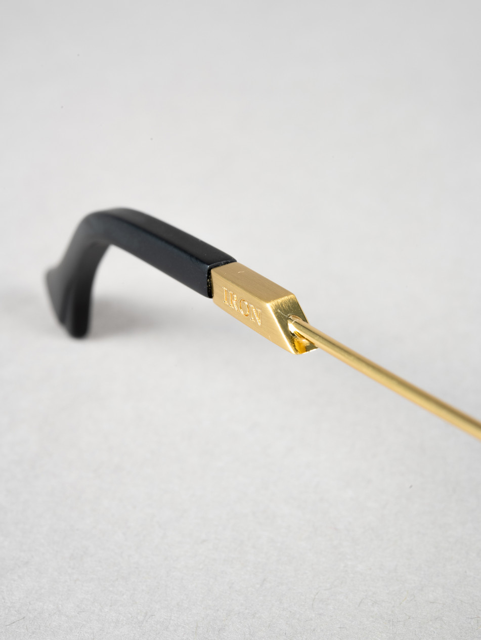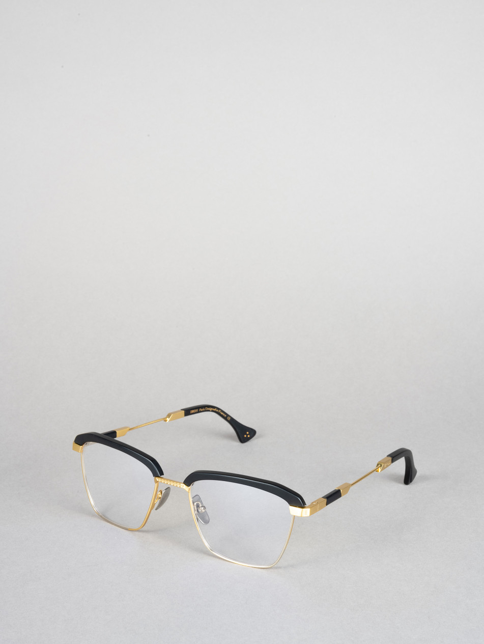 Le modèle IRO56 propose une monture optique rectangulaire en acétate noir avec des accents métalliques dorés et argentés, apportant une touche contemporaine inspirée des formes géométriques des années 80.